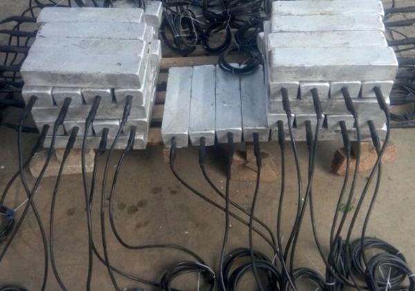 以上的鎂合金犧牲陽極也可以經(jīng)組裝后提供給客戶。裸陽極首先和電纜連接,連接部位 用環(huán)氧樹脂密封。然后加填充料封裝在棉布袋里。